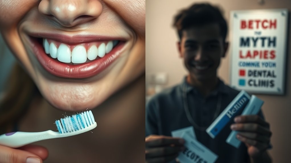 Many people believe that scrubbing their teeth with excessive force will yield a cleaner smile, but that’s a common misconception. In reality, brushing too hard can damage your enamel and irritate gums. Dental myths like this can mislead you into thinking that more effort equals better results. Instead, focus on gentle, consistent brushing with the right technique for optimal oral health. Gentle brushing techniques are essential for maintaining strong teeth and preventing damage.