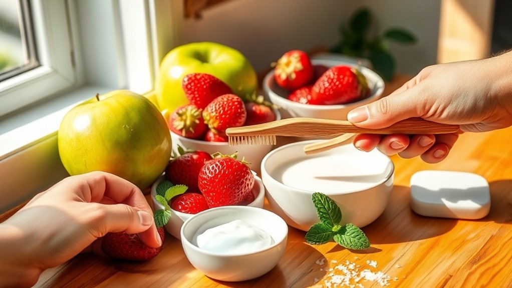 While a balanced diet lays the foundation for dental health, practicing proper oral hygiene techniques is equally essential for maintaining strong teeth. Brush twice daily with fluoride toothpaste, floss daily to remove plaque, and use mouthwash to kill bacteria. Implementing these habits will guarantee your oral hygiene is effective and your smile remains bright. Regular use of a DIY mouthwash can help neutralize odors and promote lasting freshness in your mouth.