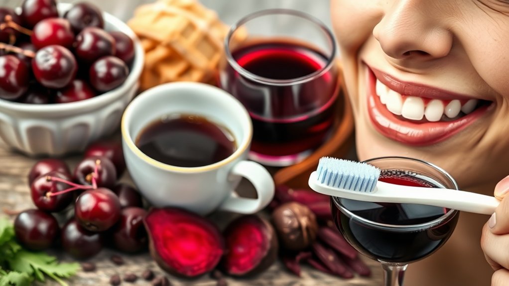 Coffee and tea are beloved beverages, but they can be detrimental to your smile. Both are classified as teeth staining foods due to their high tannin content, which can cause discoloration over time. When you sip these drinks, the pigments adhere to your enamel, leading to yellowing or brownish stains. To minimize their impact, consider drinking through a straw, rinsing your mouth with water afterward, or choosing lighter blends with less staining potential. Regular dental cleanings can also help maintain your pearly whites. Being mindful of your coffee and tea habits can keep your smile looking its best, especially by understanding how tannins interact with proteins in enamel.