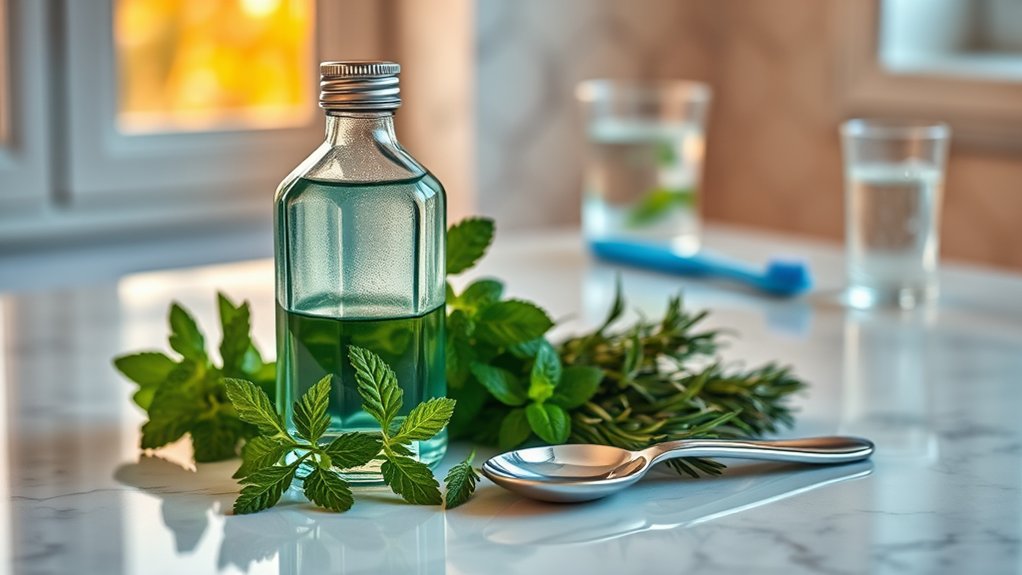 Many people are exploring natural mouthwash alternatives as a way to maintain oral health without synthetic ingredients. Options like saltwater, baking soda, and herbal infusions offer varying benefits. Saltwater can reduce inflammation and promote healing, while baking soda neutralizes acids and freshens breath. Herbal mouthwashes, such as those containing tea tree oil or echinacea, may possess antibacterial properties. However, it’s important to note that while these alternatives can help, they mightn’t provide the same comprehensive protection as traditional mouthwashes. Disrupting the oral microbiome can also occur with over-reliance on synthetic products, so always consult with your dentist to ensure these options fit into your overall oral care routine effectively.