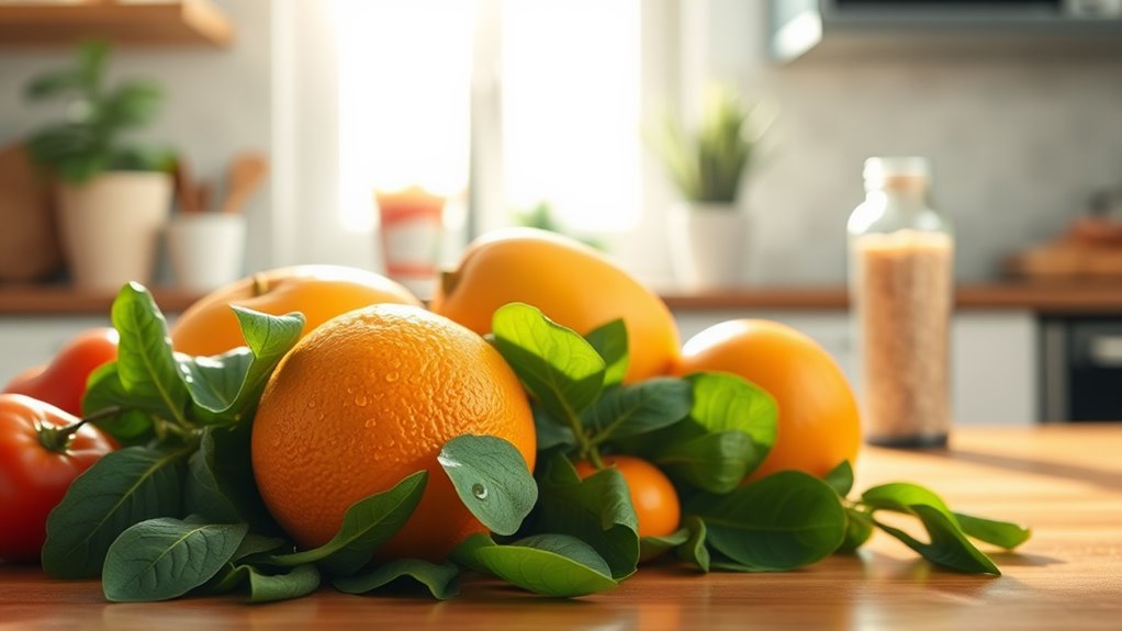 You’ll find citrus fruits like oranges, lemons, and grapefruits bursting with this vitamin, perfect for a refreshing snack or a morning boost. Strawberries and kiwi also offer a sweet way to up your intake.