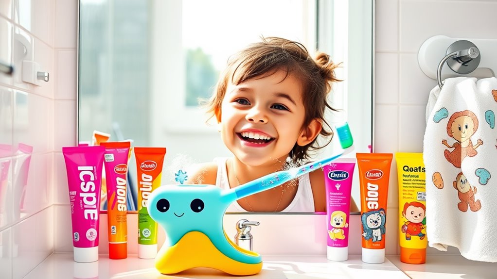 To transform brushing teeth into an exciting experience, you can create a fun game that captivates your child’s imagination. Start by assigning them a superhero identity, like “Captain Cavity Fighter.” Use a timer and challenge them to defeat plaque monsters by brushing for two minutes. You could even play their favorite music as the battle soundtrack!