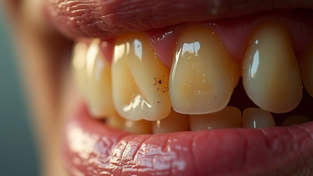 Your teeth’s aging process involves multiple phases, starting with initial wear patterns in your twenties and progressing to more noticeable changes in middle age. The protective enamel thins, revealing yellower dentin underneath, while microscopic cracks develop from years of use. Gum tissue naturally recedes, exposing sensitive root surfaces and creating new vulnerable areas. Additionally, your teeth’s nerve chambers shrink over time, affecting their ability to sense temperature changes and pressure. To combat these changes, it’s essential to incorporate calcium-rich foods into your diet, as they help build and maintain tooth structure, preventing decay.